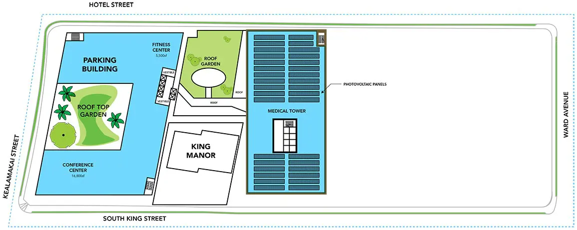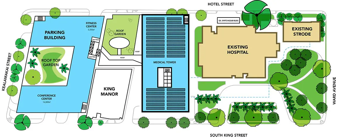 New garden spaces: We will be replacing the Palma, Milnor and Makai clinic buildings with significant green space and landscaping. The removal of the buildings on the corner of South King Street and Ward Avenue will allow for more open views from Thomas Square.